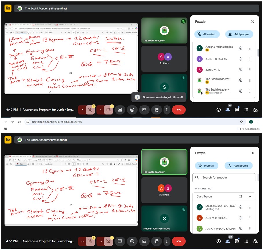 An online awareness program was conducted on 1st August 2025 at 4:00 PM, focusing on the 439 vacancies announced by the Government of Goa across various departments through the Goa Staff Selection Commission. This initiative aimed to inform Civil Engineering and Mechanical Engineering students about the available opportunities and the application process.