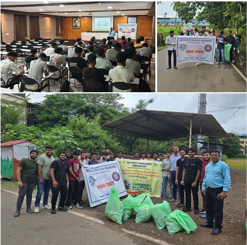 The NSS Unit of Don Bosco College of Engineering, Fatorda, Margao–Goa, in collaboration with the Goa Waste Management Corporation, organized an impactful awareness session and cleanliness drive as part of the national campaign “Swachhata Hi Sewa” on 26/09/2025. The event aimed to educate students and the community on the importance of proper waste collection, segregation, and scientific disposal. Dr. Rajath Rajaram Chitari, Assistant Manager at Goa Waste Management Corporation and a seasoned environmental expert, was invited as the guest speaker. With a rich academic background in marine sciences and environmental engineering, and over a decade of research experience, Dr. Chitari shared valuable insights into Goa’s waste management challenges. Emphasizing the need for source segregation and citizen participation, he encouraged NSS volunteers and students to adopt sustainable practices. Following the session, NSS volunteers actively participated in a cleanliness drive, collecting waste in designated areas while promoting messages of “Zero Waste Goa” and “Swachh Bharat.” The event was visually documented thro showing enthusiastic student involvement, banners advocating environmental responsibility. This initiative not only deepened awareness but also reinforced the role of youth in driving social and environmental change.