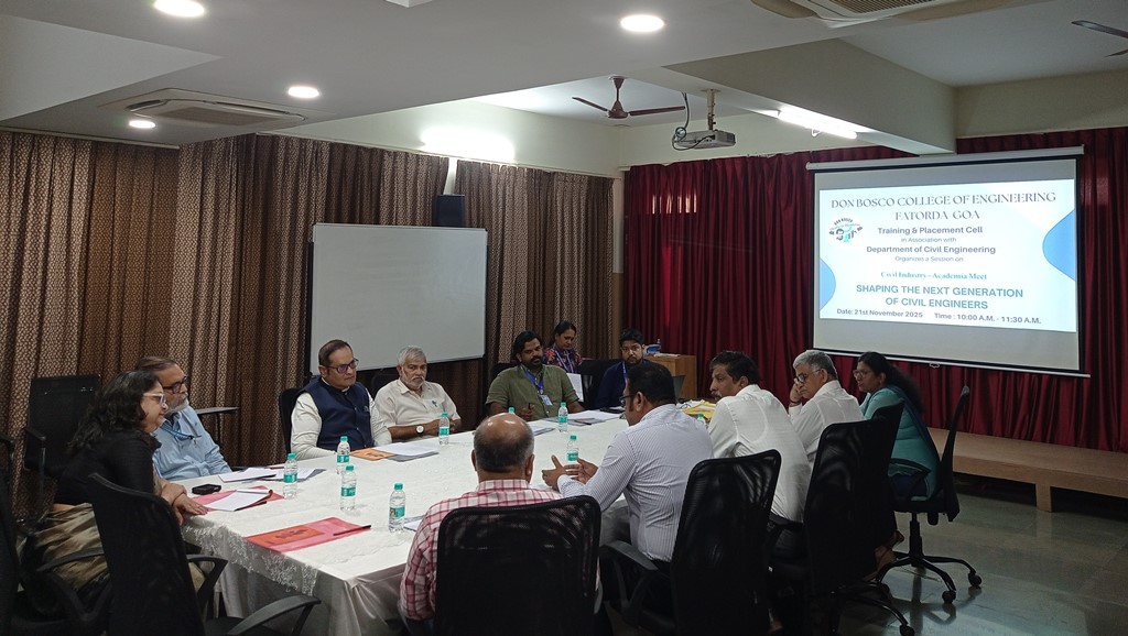 The Training and Placement Cell of Don Bosco College of Engineering, in collaboration with the Department of Civil Engineering, organized the Civil Industry–Academia Meet: Shaping the Next Generation of Civil Engineers on 21st November 2025 at the Board Room. The programme brought together industry professionals, the Principal, and faculty members to deliberate on strengthening the industry readiness of civil engineering students.