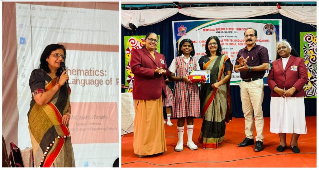 Mrs Vaishali Parakhi, Mathematics faculty member in the Department of Science and Humanities, was invited as the Chief Guest and Resource Person for the event “Mathelete 2025 – Celebration of Mathematical Brilliance” organized by Perpetual Succour Convent High School, Navelim, South Goa on 17th December 2025. The objective of the event was to create awareness about the importance of Mathematics and to motivate students to develop interest in the subject. In her address, she highlighted the role of Mathematics in developing logical and analytical thinking and emphasized its applications in emerging fields such as Artificial Intelligence, Data Science, and other future technologies, describing Mathematics as the language of the future.