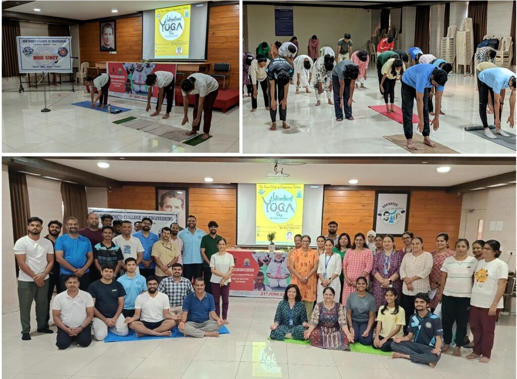 The Department of Physical Education and Sports at Don Bosco College of Engineering, Fatorda, headed by Clifford Britto, Director of Physical Education and Sports, organized a special session to mark 11th International Yoga Day on 21st June 2025. The event was held in the college auditorium and witnessed active participation from students, faculty, and staff members.