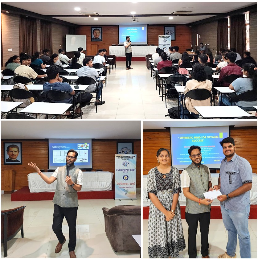 The Entrepreneurship Cell (E-Cell) of Don Bosco College of Engineering successfully hosted a compelling and power-packed session on ‘Optimistic Mind for Optimum Success’ on 27th of September 2025. The session was delivered by Prof. Vithoba Narayan Mhalkar, Assistant Professor and Group A Gazetted Officer at the Institute of Psychiatry & Human Behaviour, Bambolim Goa. Prof. Mhalkar’s session was incredibly energising and deeply motivational, relating many concepts directly to audience’s personal lives. He provided excellent tips on managing our emotions effectively. The session included a good interaction with all participants, who thoroughly enjoyed the talk and left with valuable learnings on achieving optimum success.