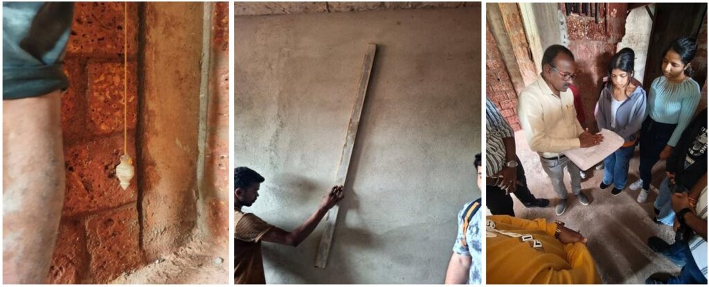 The site engineer guided the students through project drawings, construction activities, and site practices, helping them connect classroom theory to practical applications. Students observed alignment checking, plastering execution, concrete grades, plastering ratios, surface preparation techniques (hacking), building material identification, structural elements, space planning, and cost considerations for both residential and commercial units.