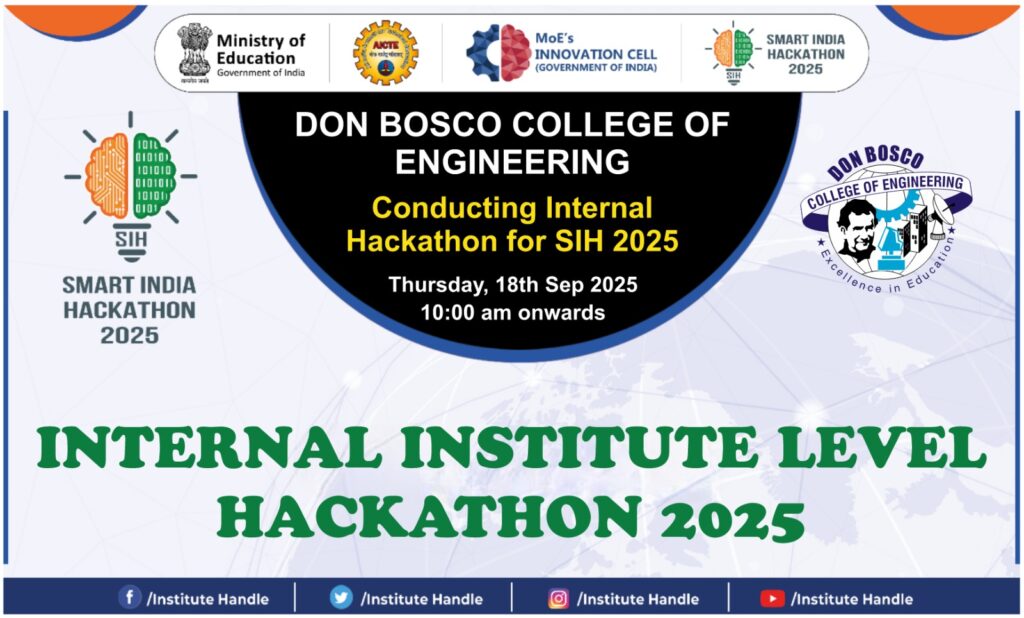 As part of this initiative, Don Bosco College of Engineering organized an Internal Institute Level Hackathon in the form of an Idea Competition to shortlist teams for participation at the national level. The event, open to students of all years and branches, was held on Tuesday, 18th September 2025, on campus. A total of 12 interdisciplinary teams, each comprising six members, took part in the competition and presented their innovative ideas.